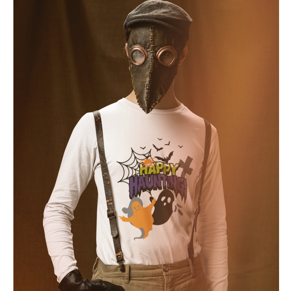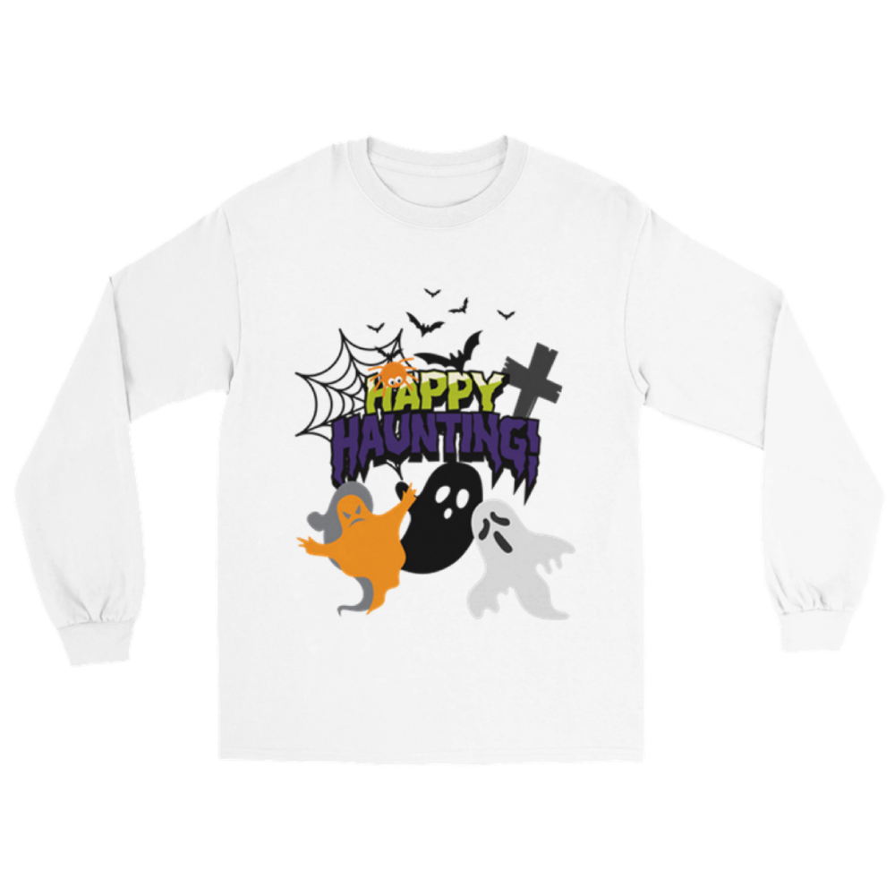 Get ready to have some spooky-fun this Halloween in our Happy Haunting long sleeve tshirt! It's perfect for a ghostly giggle, a sinister smirk, or a good old-fashioned fright night! (And if you're brave enough to wear it all year round, we won't judge!)